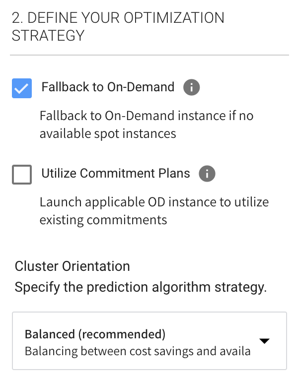 • Continuous Optimization: If fallback to on-demand instances has occurred, you can choose when your workload should be returned to spot instances or moved to an instance type that has already-purchased an available reserved capacity. Switch this On (default) to return the instances automatically.